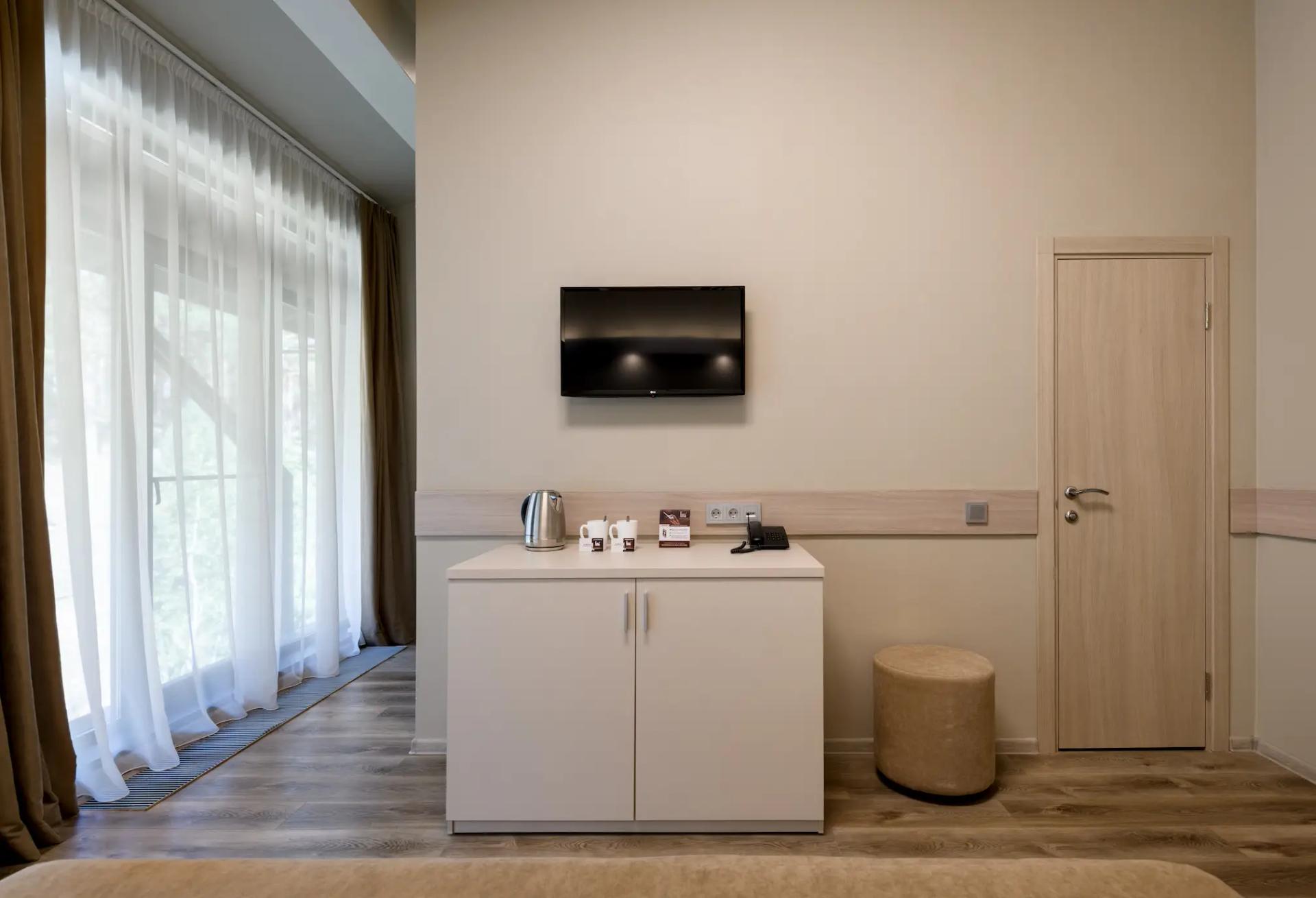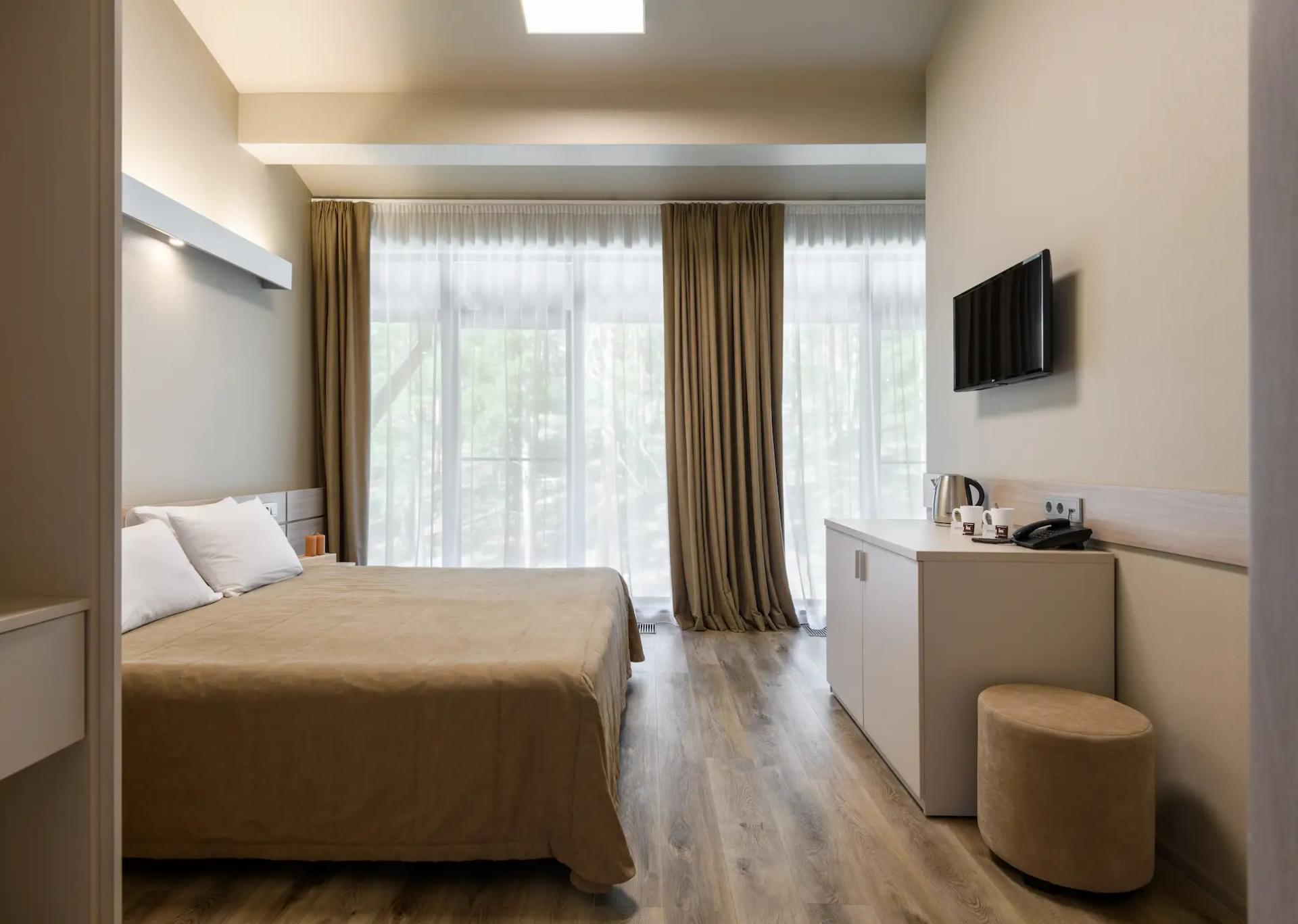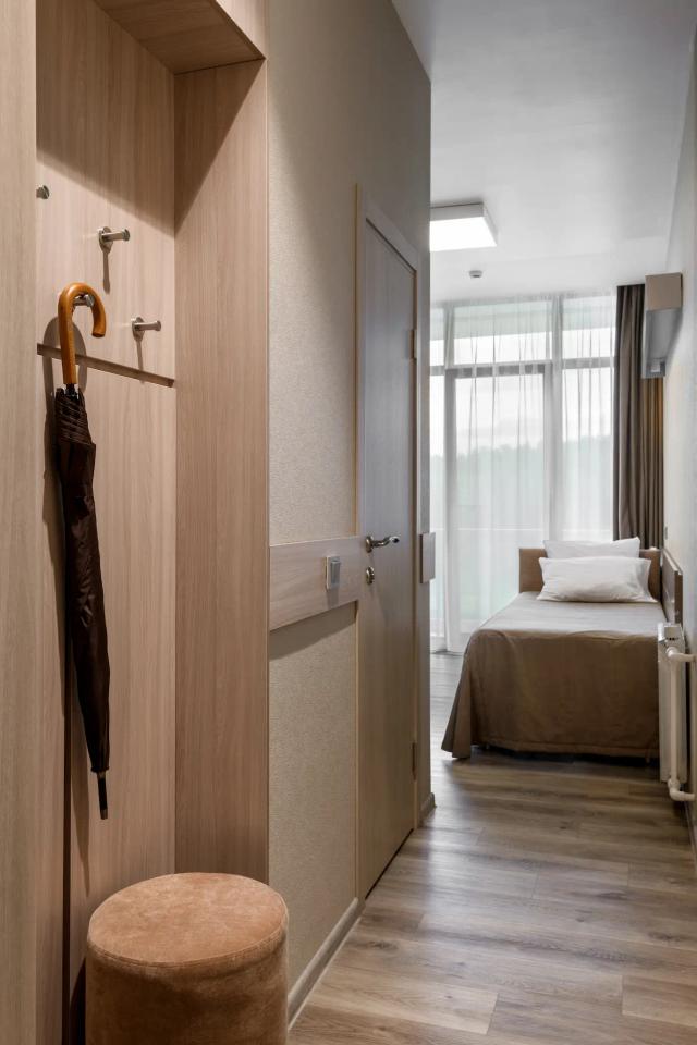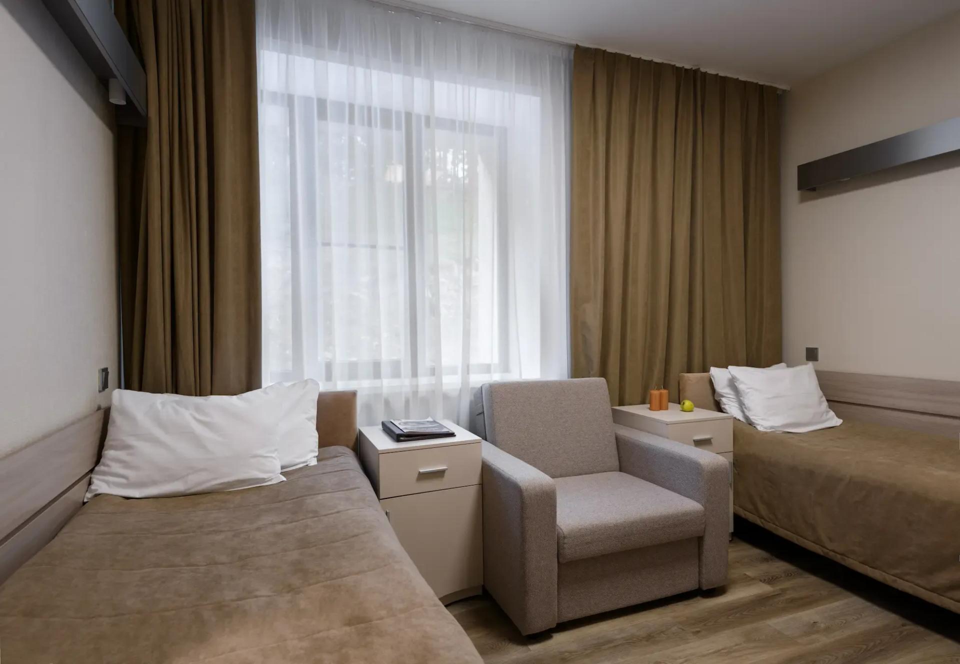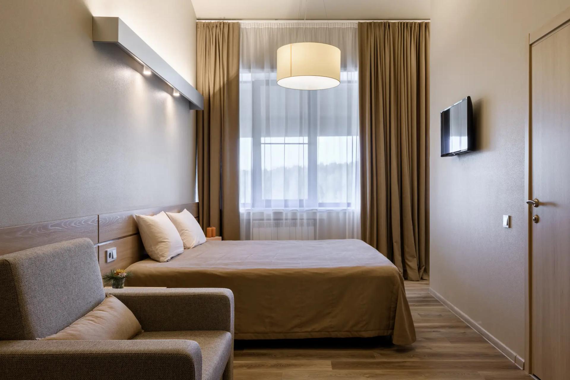 Вы можете выбрать номер на солнечной или северной стороне. Вид из окна на лиственный лес или пруд. Отделка выполнена из светлых приятных оттенков для лучшего отдыха наших гостей. В номере для вашего удобства: две односпальные или одна двухспальная кровать с прикроватными тумбочками, шкаф для одежды, тумба. Туалетная комната и душ. Кроме того, чайник, кружки, фен и телевизор в каждом номере.