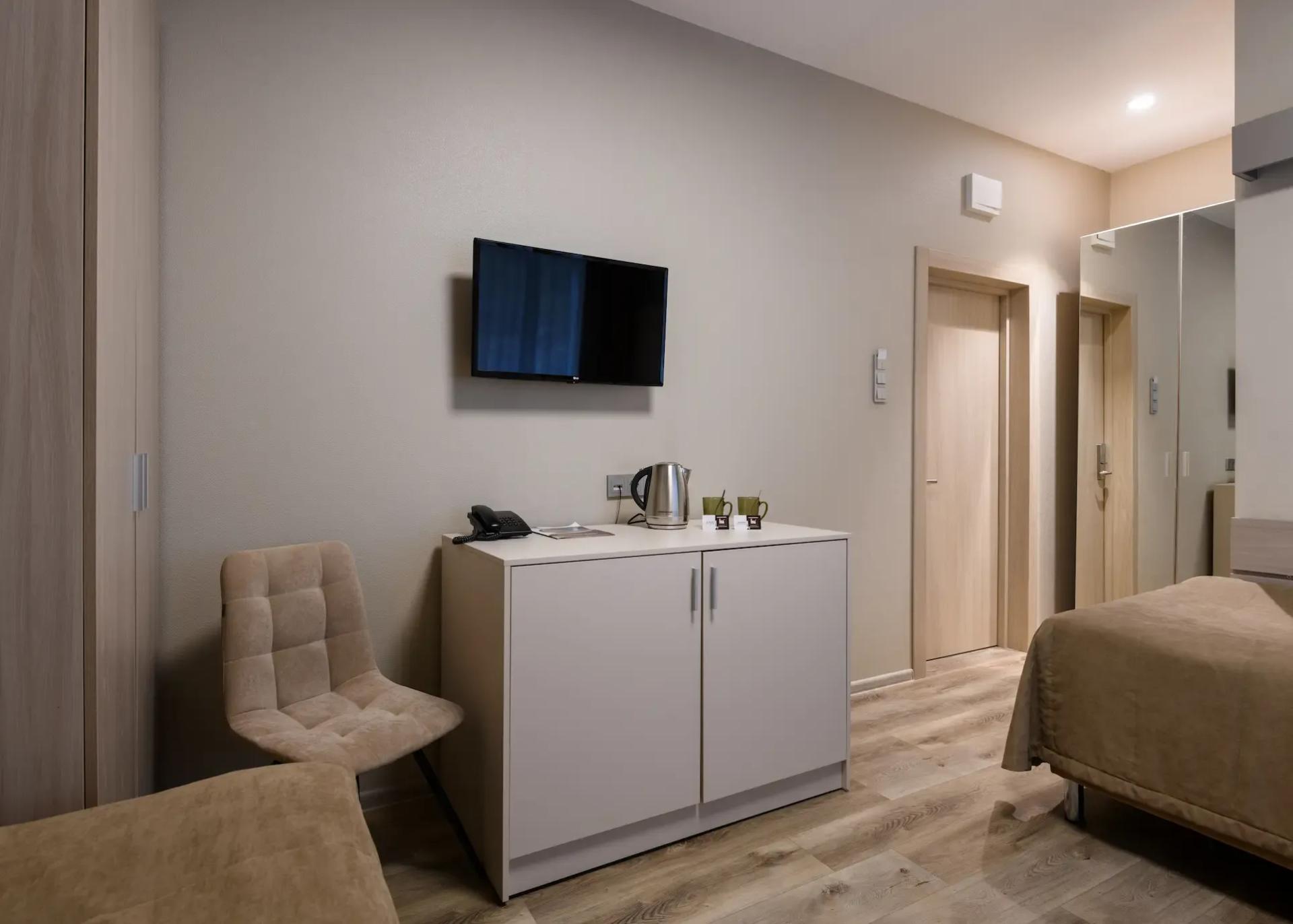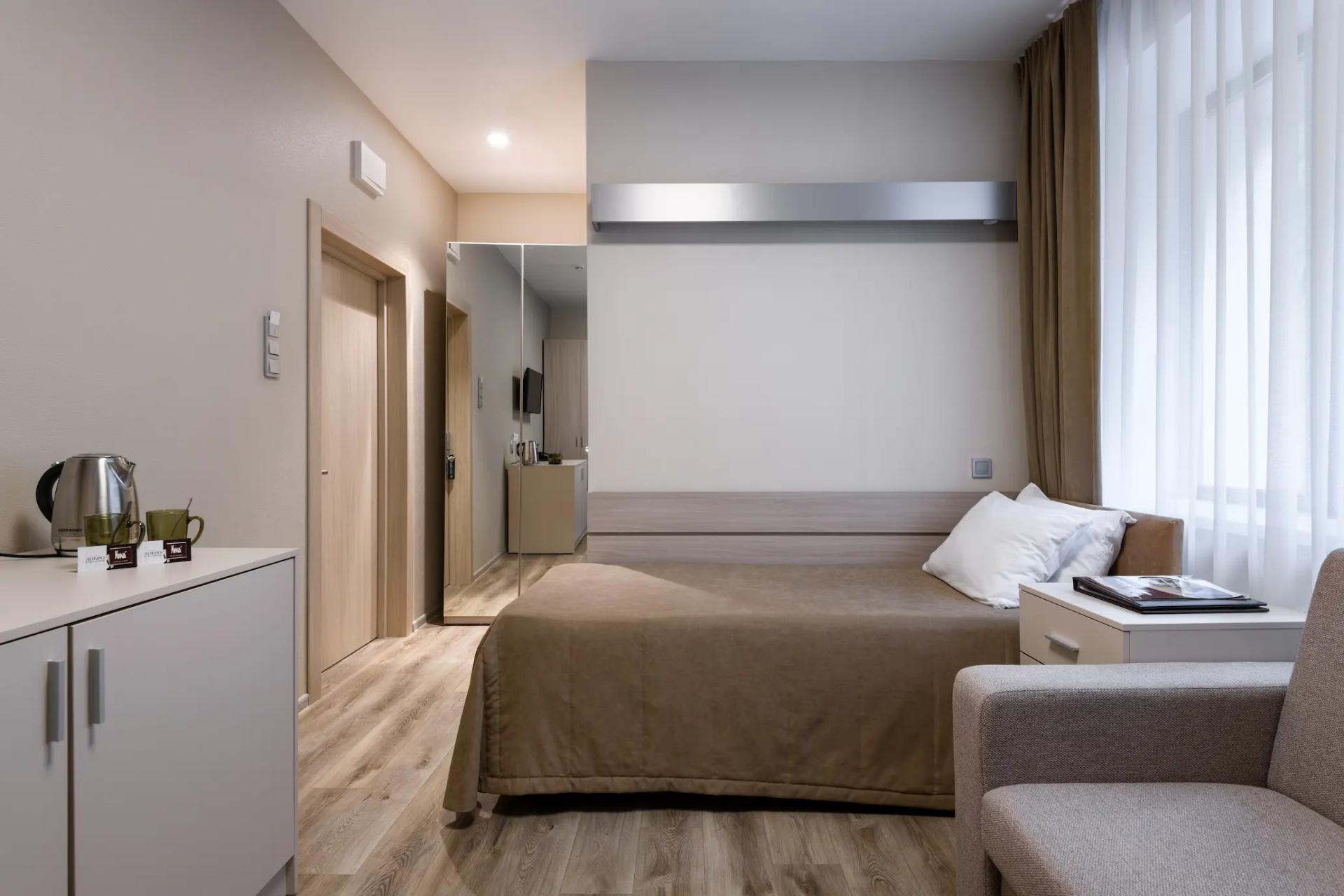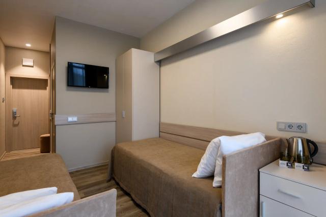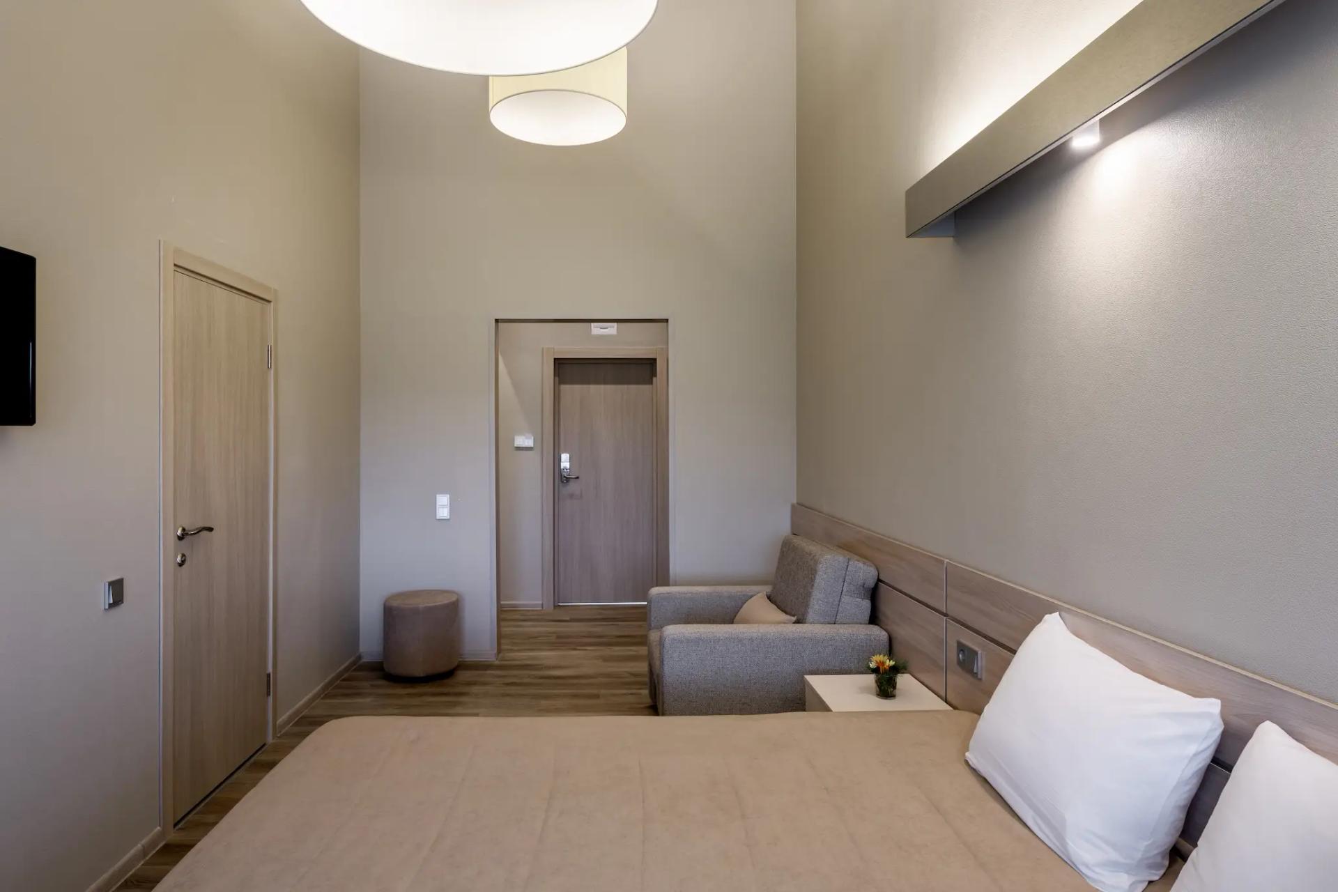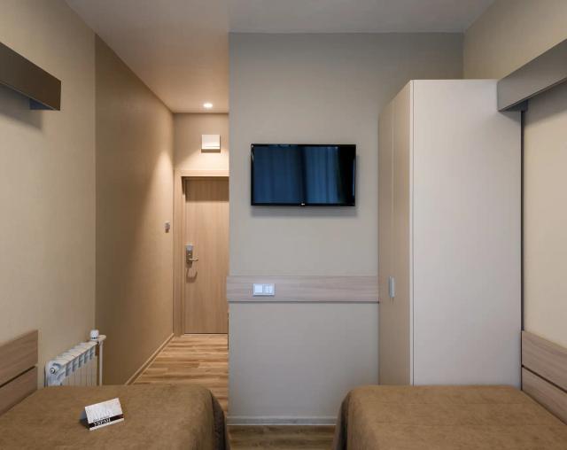 Вы можете выбрать номер на солнечной или северной стороне. Вид из окна на лиственный лес или пруд. Отделка выполнена из светлых приятных оттенков для лучшего отдыха наших гостей. В номере для вашего удобства: две односпальные или одна двухспальная кровать с прикроватными тумбочками, шкаф для одежды, тумба. Туалетная комната и душ. Кроме того, чайник, кружки, фен и телевизор в каждом номере.