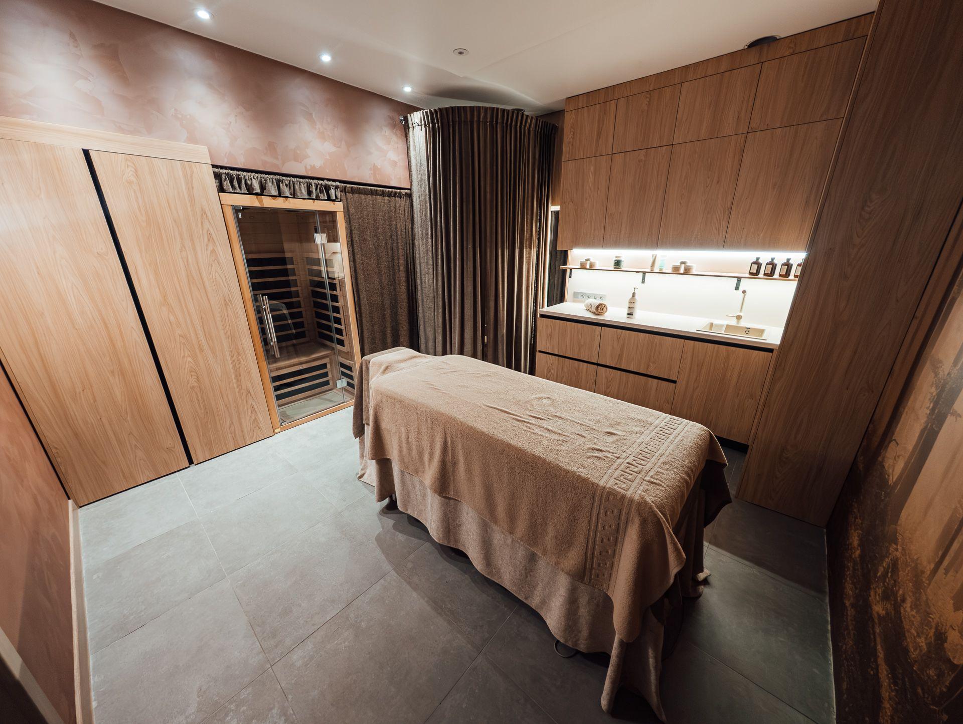 Приглушённый свет и тепло натурального камня создают атмосферу полного расслабления. Здесь проводятся массажи тёплыми камнями, обертывания, пилинги и SPA-уходы с использованием профессиональной косметики. Инфракрасная сауна мягко подготавливает тело к процедурам, помогая